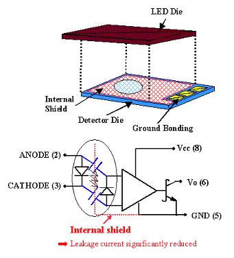 因此,设计人员使用屏蔽技术,最大限度地降低泄漏电流,使剩余的泄漏电流从输出IC的关键节点分流出去,特别是光电探测器区域。光电耦合器的屏蔽性能对整体抗CMR能力至关重要。安捷伦采用专有屏蔽技术,提供了高达15 kV/μsCMR性能 (1)。通过优化输入电路,如把LED偏置电阻器分开,使用不要求上拉电阻器的低阻抗输出阶段,可以进一步改善性能。